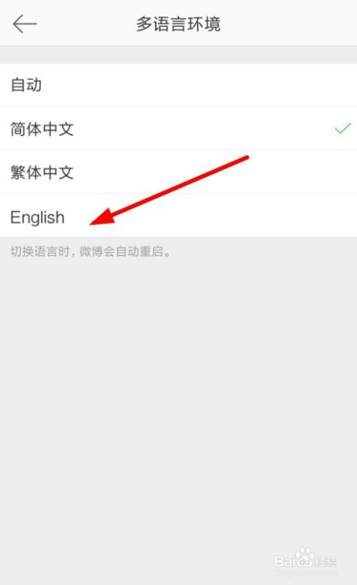 我们点击English的说话情况,选择之后微博会主动重启的。