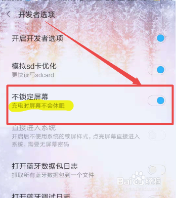然后点击它后面的开启滑块,将 不锁定屏幕 这个选项开启,如许就可以充电时屏幕不休眠了。
