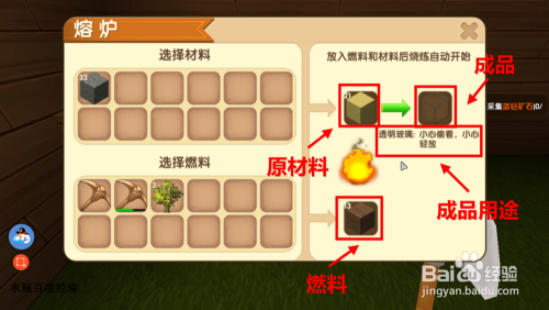 首先要有熔炼物。好比我们将细沙插手熔炼格子中,游戏会提醒将会熔炼出玻璃。有了熔炼物后我们要选择燃料,经由过程耗损燃料的体例获得成品。燃料一般都是用木材或者煤炭。熔炼也是需要花费必然时候的,在熔炼过程中我们可以去从事此外活动。