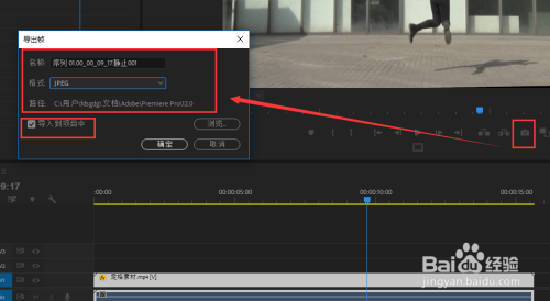 在时候轴上面的窗口中找到一个相机的按钮图标,单击该图标,弹出导出帧窗口,选择格局为JPG,勾选导入到项目中,点击确定,如许我们就将视频的一个单帧图片截取下来了,我们在C盘的存储位置与PR项目办理窗口中都可以找到这个单帧图片。
