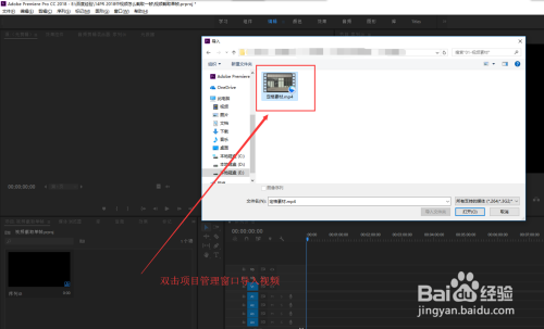 在项目办理窗口的空白处,双击鼠标左键,会主动弹出“导入”窗口,在导入窗口中找到要导入视频的电脑地址,选中将视频素材导入到PR 2018中。