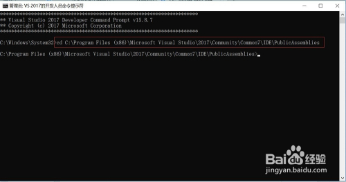 在打开的VS2017的开辟人员号令提醒符对话框中,经由过程cd定位到目次,如下图所示: