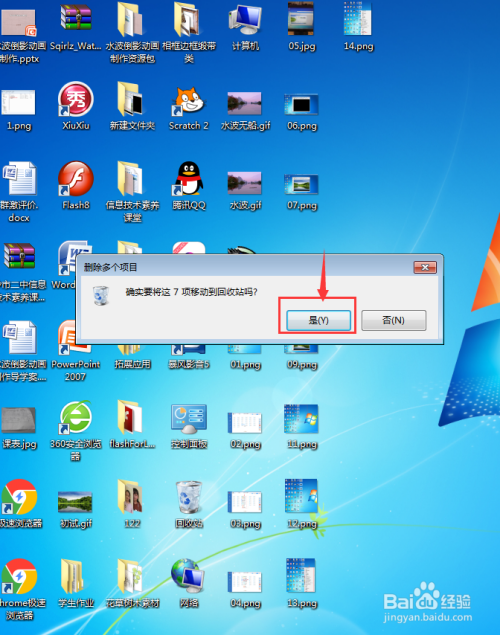在删除多个项目标对话框中点是,就可以将这些文件同时放到收受接管站中;
