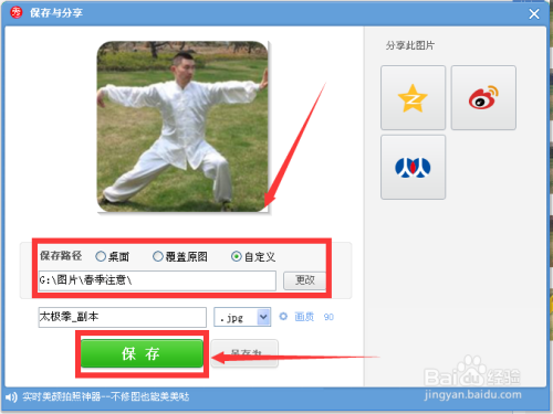 想把裁剪后的图片保留,可以单击“保留和分享”后,在保留页面选择保留路径和体例、定名后,再单击“保留”即可