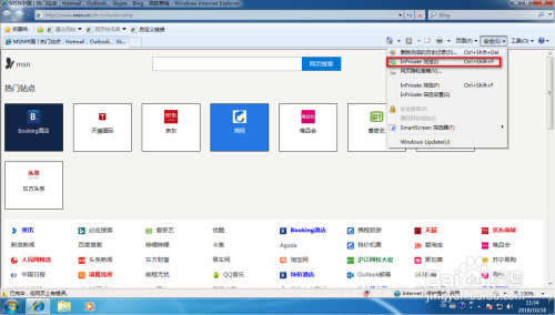点击菜单栏中的平安,选择下拉菜单中的InPrivate浏览;