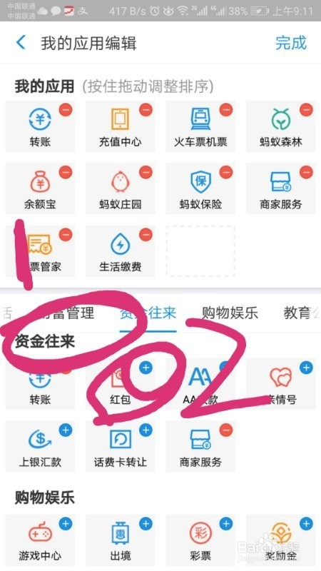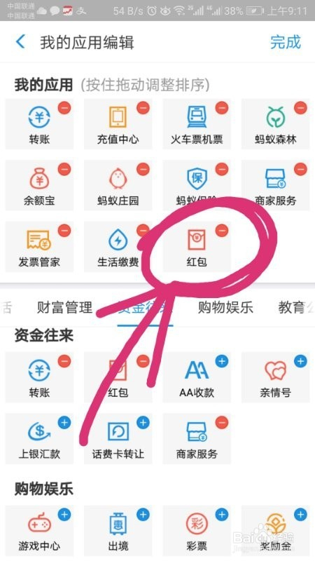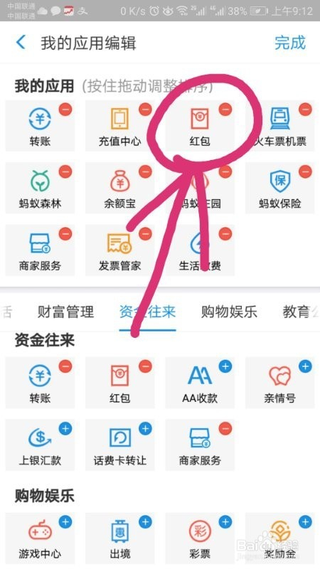 往下拉,找到“资金往来”,就可以看到你的红包了,然后点击红包右上角的蓝色“+“,你就可以把红包添加到”我的应用“了,如图。