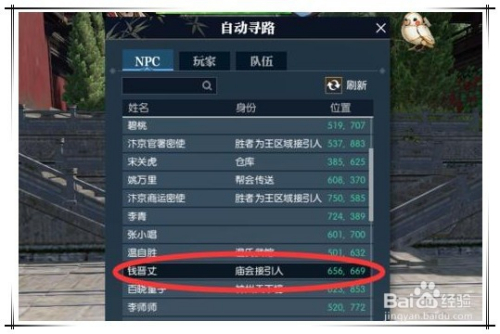 然后在NPC列表中找到该本家儿城的庙会接惹人,点击主动寻径前去。