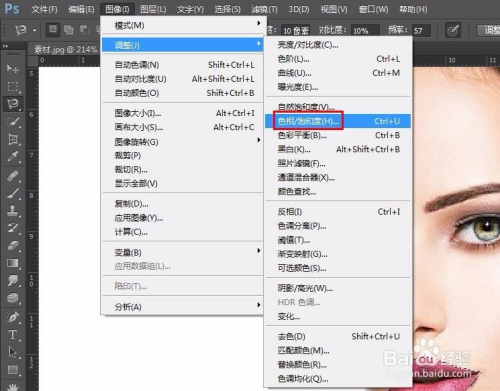 第五步:在菜单栏中选择“图形--调整--色相/饱和度”选项。