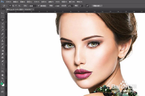 第四步:按住Alt键滚动鼠标滑轮放年夜图片,用磁性套索东西选中嘴唇区域。