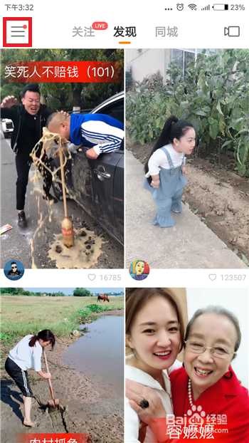 接下来打开手机中的快手,在快手的首页中找到并点击左上角的【更多】选项。