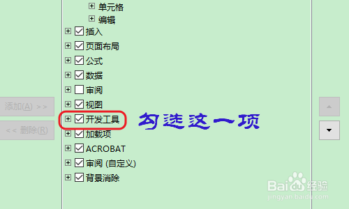 在自界说功能区的右侧,我们勾选“开辟东西”选项,返回到表格今后就会在东西栏看到方才添加的开辟东西了;