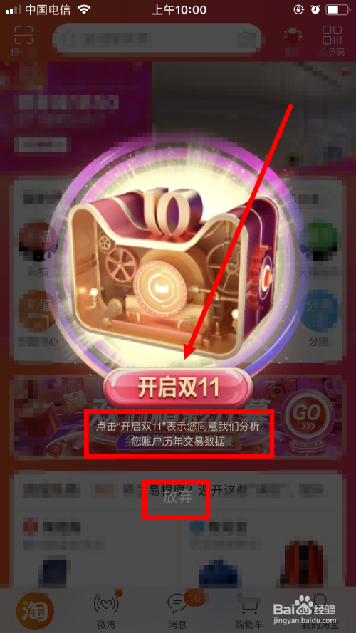 首先在手机上打开并登录淘宝App,此时,首页面会呈现一个年夜年夜的机械锁。下面有一行字 点击开启双11暗示您赞成我们阐发您账户积年买卖数据 ,这是一个申明,若是分歧的话,可以点击 抛却 。不外,小编很好奇,仍是点击了 开启双11 。