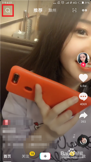 打开手机中的抖音后,在首页中找到并点击左上角的【搜刮】选项。