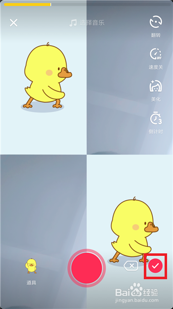 点击后就会进入到拍摄界面了,可以看到会呈现四宫格的拍摄界面,此中两个是我们两个是小黄鸭,如许就可以pk小黄鸭了,点击拍摄按钮起头录制。