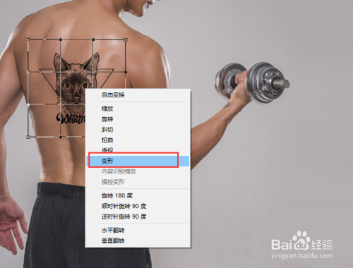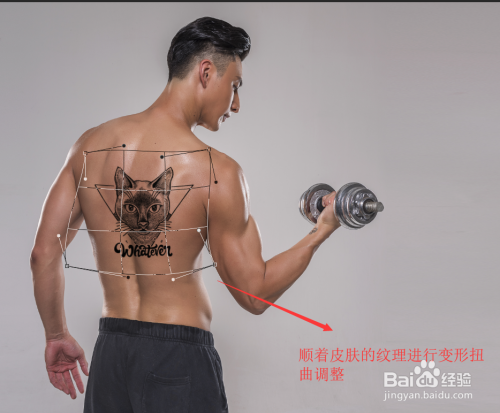 选择变形号令之后,就可以将纹身素材执行变形操作了,将纹身素材沿着人物皮肤的纹理进行变形扭曲调整,调整到合适之后确定操作。如许,我们就在PS中经由过程更改图层夹杂模式给人物添加了一个纹身了。