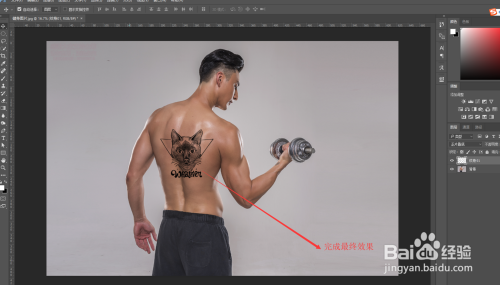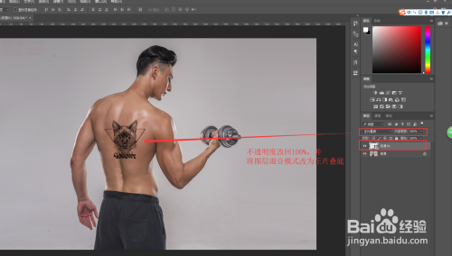 在将纹身素材图层的不透明度在改回到100%上,然后在连结选中纹身素材的状况下,将纹身素材的图层夹杂模式改为“正片叠底”,如许一个初步的纹身结果就已经呈现了。
