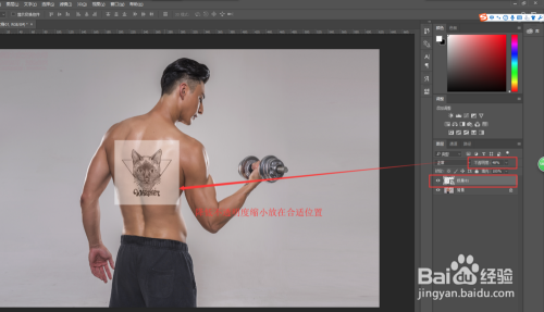 将纹身素材的不透明度降低,降到能看到人物布景图层即可,然后缩小纹身素材,并移动纹身素材将其移动到人物素材的合适的位置上。