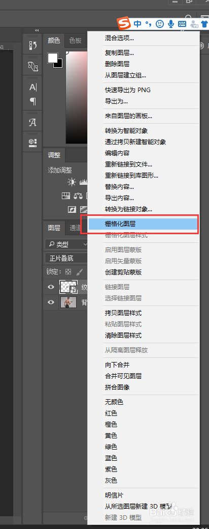 右键纹身素材图层,在弹出的右键菜单选项中选择“栅格化图层”号令,这个纹身素材的智能对象图层转换为通俗图层;然后直接按Ctrl+T快捷键执行自由变换,在右键鼠标选择变形号令。