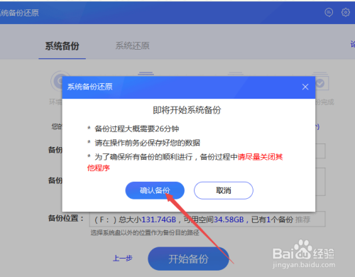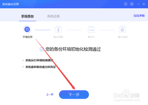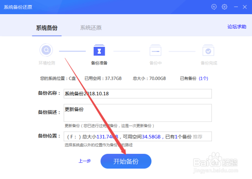 然后在打开的页面中点击 筹办备份 按钮;然后就会起头查抄系统的情况,看看当前的情况是否合适系统备份。