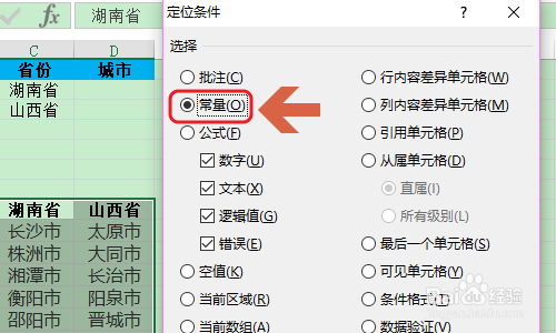 选中今后按住Ctrl+G切出定位对话框,点击左下角的“定位前提”,然后勾选此中的“常量”;