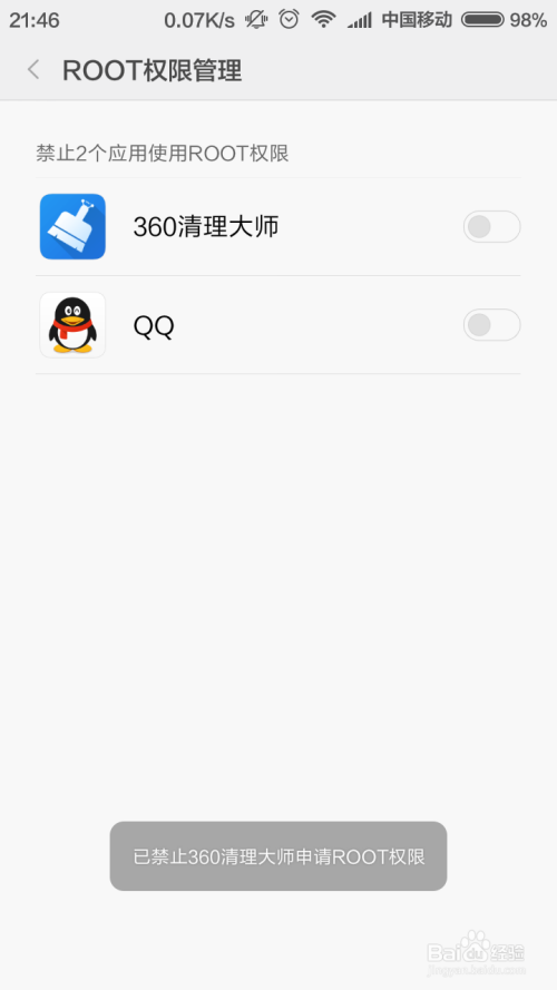 打开MIUI 开辟版系统中平安中间应用,在平安中间页面中,点击选择“权限办理-Root权限办理”选项,然后点击开启360清理巨匠应用Root权限即可。