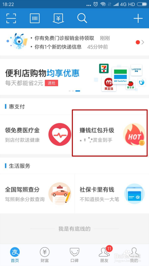 在惠付出栏我们可以看到“赚钱红包进级”的按钮,我们点击进入。