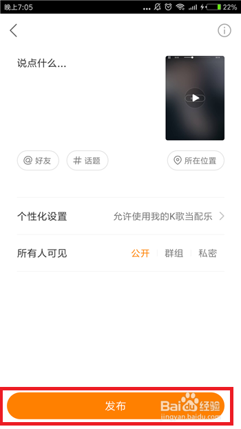 最后进入的是发布的界面,我们输入K歌的文字介绍后就可以点击【发布】了。