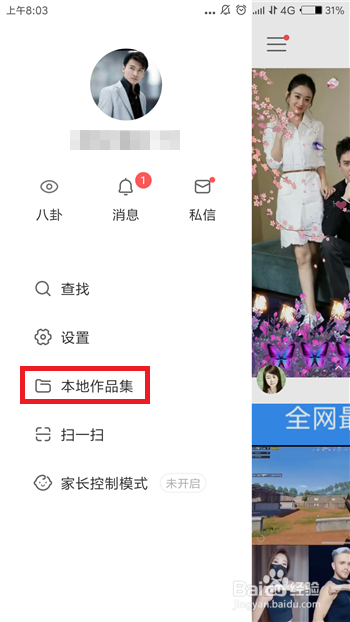 在更多选项界面中可以看到一个【当地作品集】的选项,草稿箱视频就保留在这里,点击打开该选项。