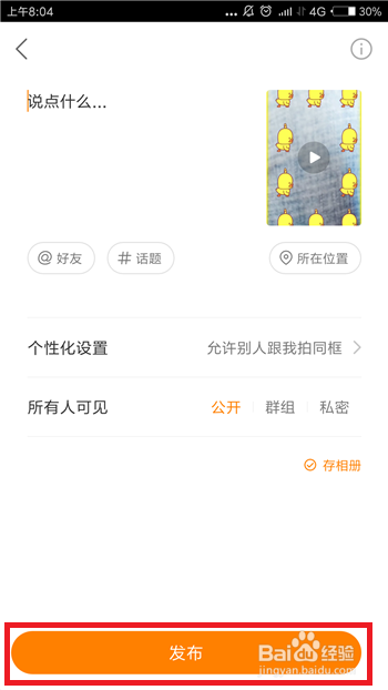 最后会进入到视频的发布界面,在发布界面中输入视频的文字介绍后点击【发布】即可把草稿视频发布出去。