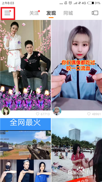 打开手机中的快手,在快手的首页中点击左上角的【三】选项打开更多界面。