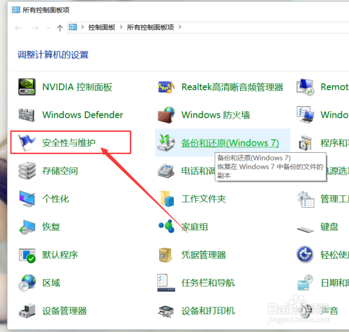 打开节制面板页面之后,点击选择”平安性与维护“菜单选项,打开该页面之后进行系统平安性与维护设置页面。