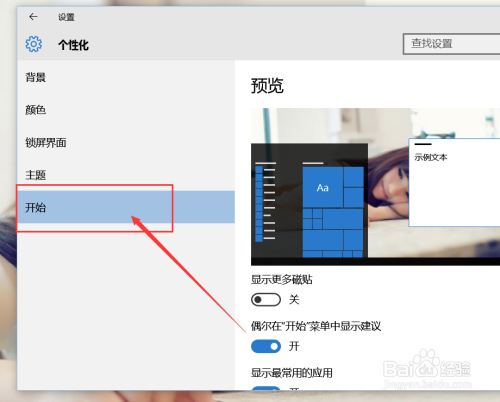 接下来,在打开的Win10系统个性化设置页面中,点击选择左侧“起头”菜单选项,进入开始菜单设置页面。