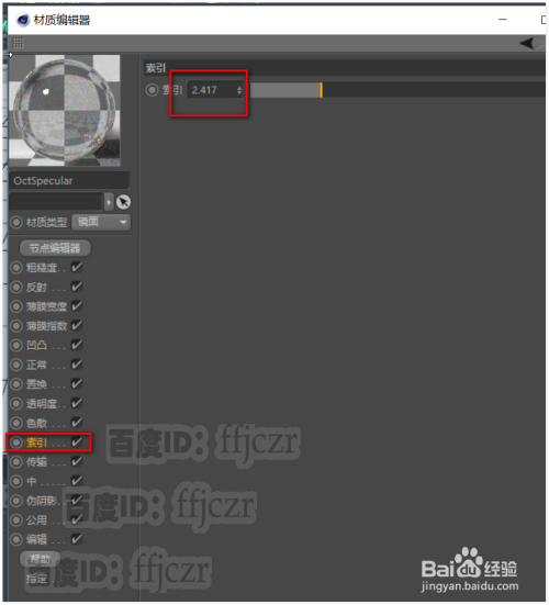 给钻石添加一个透明类材质,在索引选项中调整数值为:2.417(钻石的折射率);色散选项的值为0.03(发生色散即可,按需调整)。