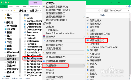 在打开的 Teracopy 文件夹中找到并右键点击:Teracopy.exe文件,在右键菜单中点击【发送到】-【桌面快捷体例】;