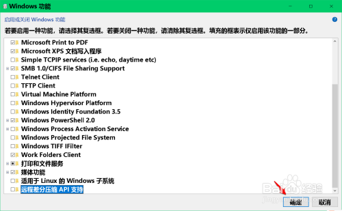 在打开的 Windows 功能窗口中,找到 长途差分压缩API撑持 ,点击去失落前面复选框中的勾;