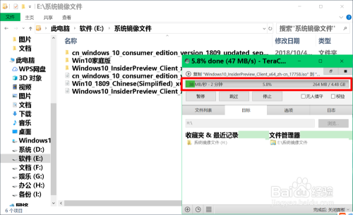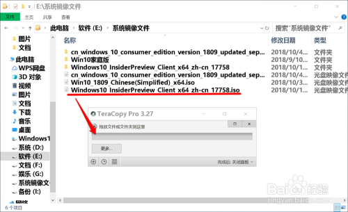 在桌面上打开 Teracopy.exe 快捷体例,将磁盘 E:\中的系统镜像文件 Windows 10 Insiderpreview Client x64 zh-cn 17758.iso拖到 Teracopy Pro 对话框中的指定框中;