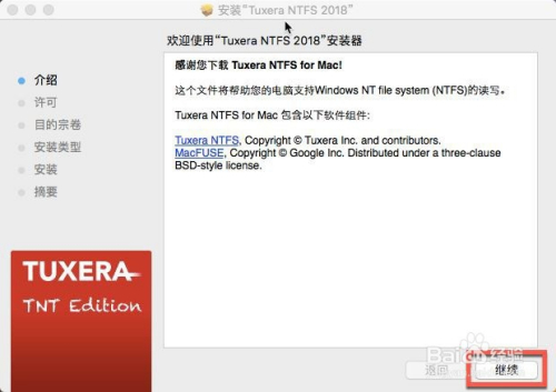 百度搜刮“Tuxera NTFS 2018 for Mac”,软件下载后,打开软件包,双击安装Tuxera NTFS进行安装,点击打开,如下图所示: