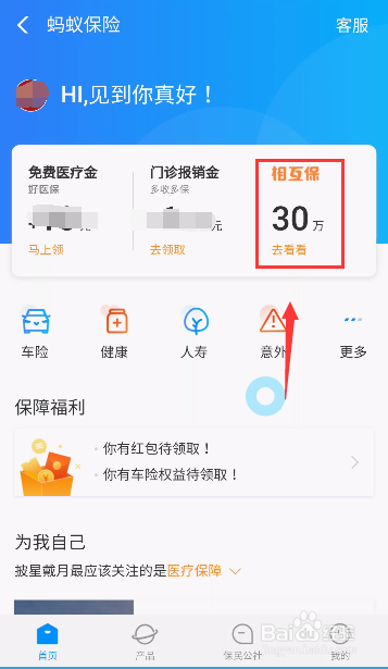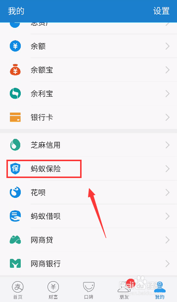 在小我界面找到蚂蚁保险单击进入,如下图所示