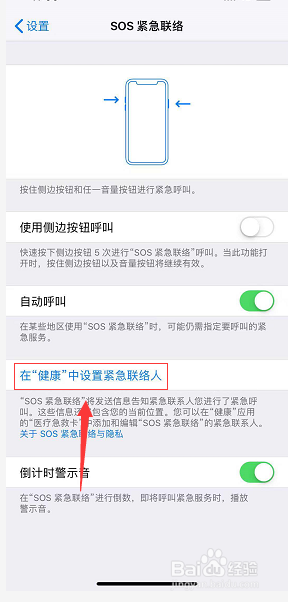 在告急联络中点击在健康中设置告急联络人,如下图所示