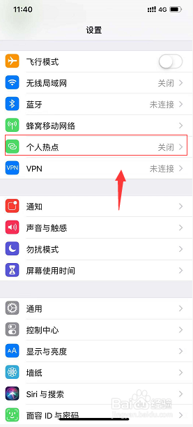 设置界面点击小我热点,如下图所示