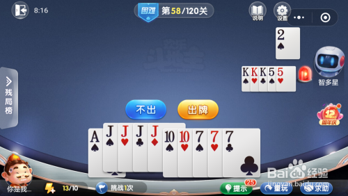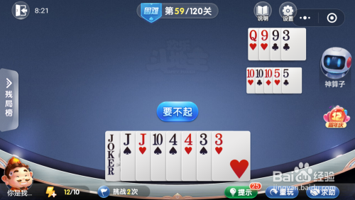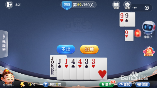 妙算子打出一张9,我打出一张J,接着打出一对4,然后打出一张J一张3就过关了。