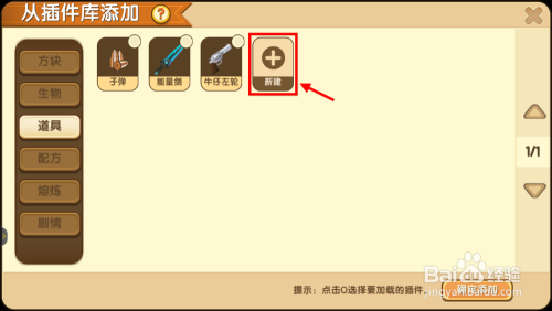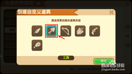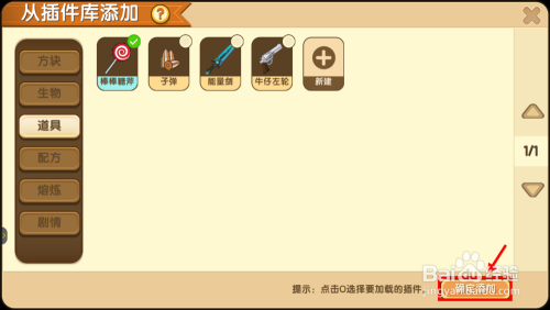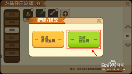 接下来会跳出一个窗口,若是已经做过近似棒棒糖斧的道具了,那么是可以在原版方块长进行点窜的,如无则点击建立新道具。