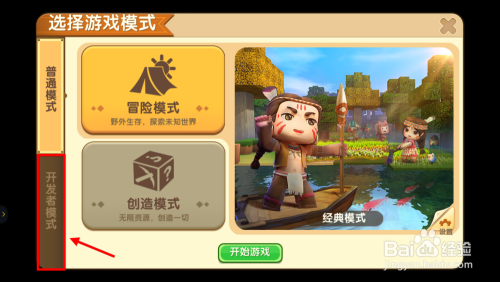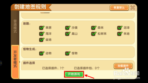 游戏本家儿界面点击起头游戏,然后选择建立新宿世界,进入后切换到开辟者模式。