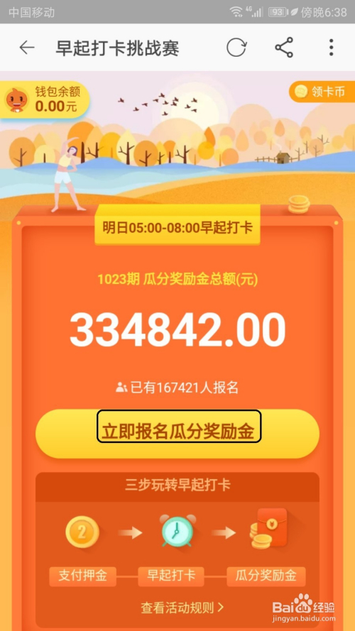随后打开夙起打卡挑战赛界面显示活动宣传画面点击当即报名瓜分奖励金按钮。