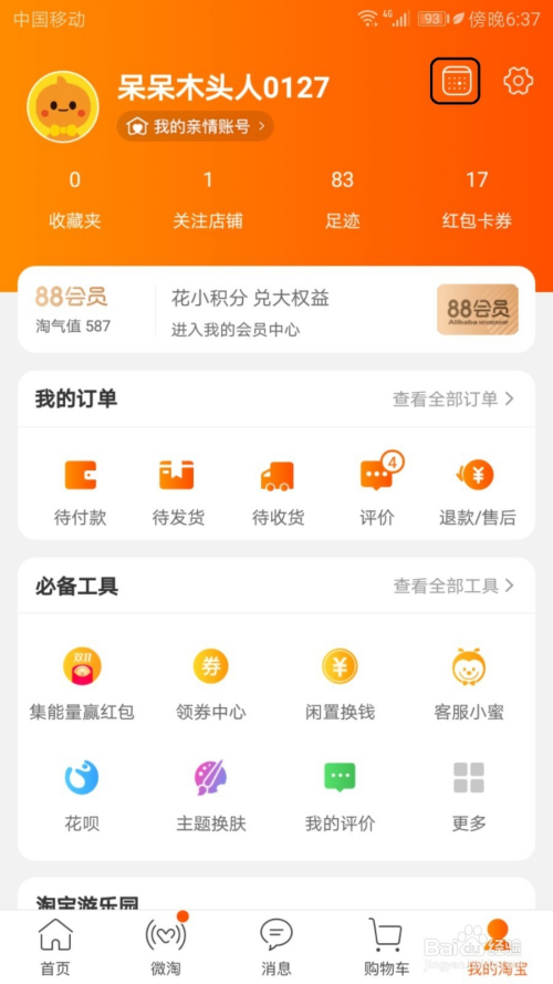 打开淘宝进入首页后点击我的淘宝导航的右上角的日历样式图标。