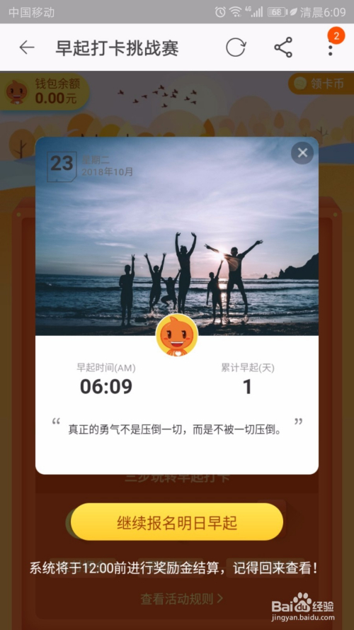 比及凌晨5点到8点时候内进入淘宝这活动点击打卡可呈现如图所示。若是继续报名明日夙起点击该按钮切换到交包管金界面。
