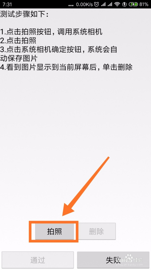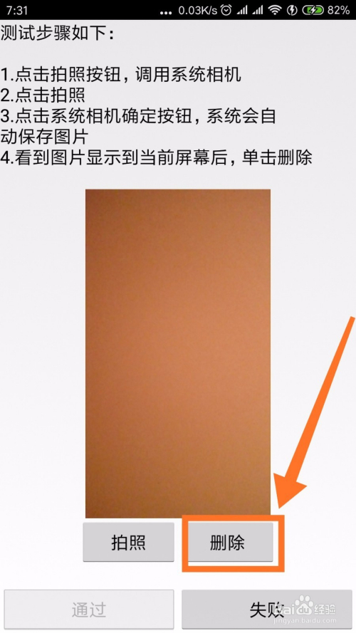 点击后置相机测试,进来后看要求,然后拍一张照片,会主动保留,然后点击【删除】然后点击【经由过程】即可。