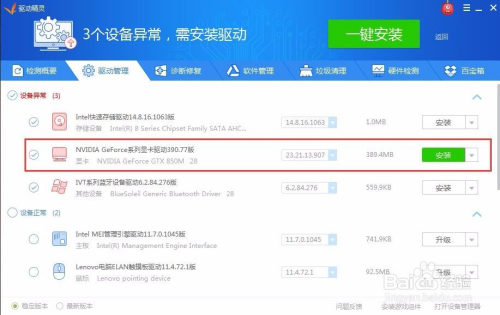 接下来,我们在软件检测到的驱动法式问题中,点击“驱动办理”选项,对需要安装的显卡驱动法式,点击“安装”按钮。