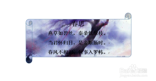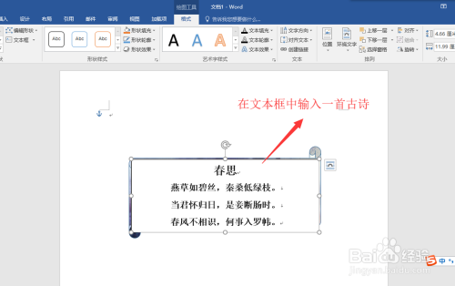 在选择插入菜单,在插入菜单中选择插入一个简单文本框,然后在插入的文本框中输入我们要输入的古诗一首。