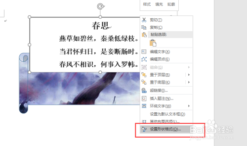 选中输入古诗的文本框,右键鼠标选择“设置外形格局”号令,然后在设置外形格局窗口中设置文本框的填充与线条都为无。再将文本框移到画卷图形的上面。如许我们就在Word2016中建造了一个古风的画卷。